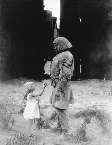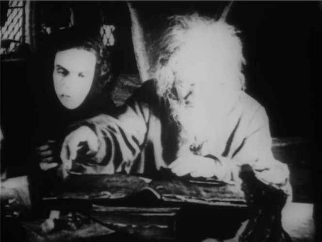 Tom Wiener, All-Movie Guide "Of the four extant versions of this perennial horror classic, Paul Wegener's 1920 version remains the best. Wegener both directs and stars in this extraordinarily vivid, magical, brooding film. His hulking claylike monster is an archetype, and the astonishing, angular, teetering sets by Hans Poelzig are an example of the nightmare world of the occult made breathtakingly concrete." "The oddest thing about The Golem (whose subtitle, "How He Came Into the World" distinguishes itself from several other Golem films, a couple of which were also directed by Wegener) is how much it relies on suggestion for effect. For all its lavish production values, it shows us very little in terms of its story's darker turns. ... As danger may lurk in the shadows of the frame, so too does it lurk in the dark possibilities of the tale. The Golem is not so much a horror film as a suggestive piece of fantasy. The film exists in a world where powerful rabbis conjure up spells and see visions of the future, where figures from the past directly alter events in the present. ... In fact, it might be rewarding to see the film as an intriguing counterpoint to F.W. Murnau's Nosferatu ..., where the physically frail, though certainly gruesome, vampire has powers that can transcend space, can cause madness and disease. The Golem, physically imposing as he is, is just a large, unthinking brute, at the mercy of those around him, even small children. The whisper-thin vampire and the burly automaton are in a sense the two great monsters of 1920s German cinema. "Paul Wegener had too strong a personality to be content with merely imitating [Max] Reinhardt's style. His treatment of the magical lighting-effects found at the Deutsches Theater was to adapt them to the needs of the cinema. From his previous work in natural settings he kept a fluidity of atmosphere which he managed to bring to his studio-made Golem. An airy lightness hangs about the shots of the flower-garlanded children playing in front of the ghetto gates. Wegener uses every one of [Max] Reinhardt's lighting-effects: the stars glinting against a velvety sky, the fierty glow of the alchemist's furnace, the little oil-lamp lighting a corner of the darkened room when Miriam appears, the servant holding a lantern, the row of blazing torches flickering in the night, and, in he synagogue, the light trembling over the prostate, indistinct forms wrapped in cloaks, with the sacred, haloed seven-branched candelabra emerging from the darkness." "Wegener was a cinematic visionary who strived to enhance his films with inventive camerawork. 'The real creator of the film must be the camera. Getting the spectator to change his point of view, using special effects to double the actor on the divided screen, superimposing other images all this, technique, form, gives the content its real meaning,' he said in a 1916 lecture. 'Everything depends on the image, on a certain vagueness of outline where the fantastic world of the past meets the world of today. I realized that photographic technique was going to determine the destiny of the cinema. Light and darkness in the cinema play the same role as rhythm and cadence in music.' |